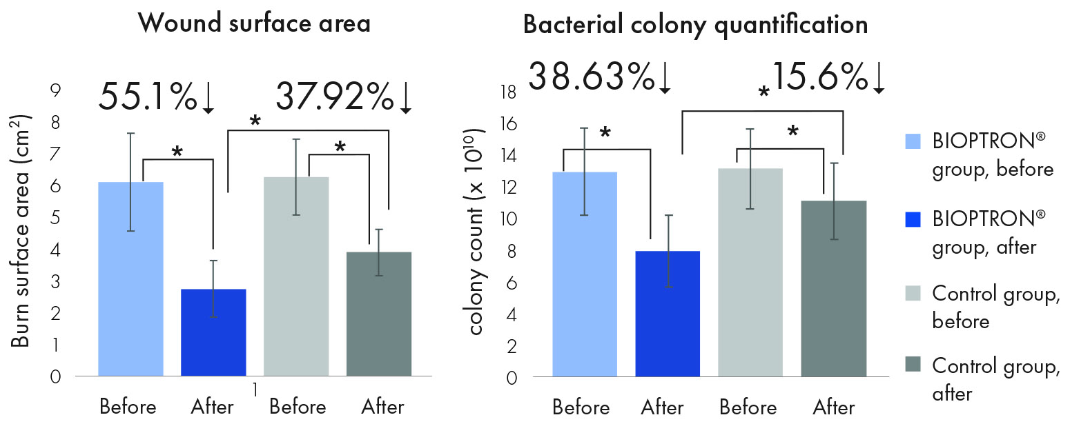 Abbildung links: Die Verbrennungsfläche wurde in nur einem Monat von 9,5 cm2 auf 4,2 cm2 reduziert, was einer Abnahme der Wunde um 55,1% entspricht (im Vergleich zu weniger als 38% in der Kontrollgruppe (mit LLLT behandelt)). Abbildung rechts: Die Bakterienkoloniezahl sank signifikant mehr als doppelt so stark wie in der Kontrollgruppe (Abnahme in der BIOPTRON®-Gruppe um 38,63% im Vergleich zu 15,6% in der Kontrollgruppe).